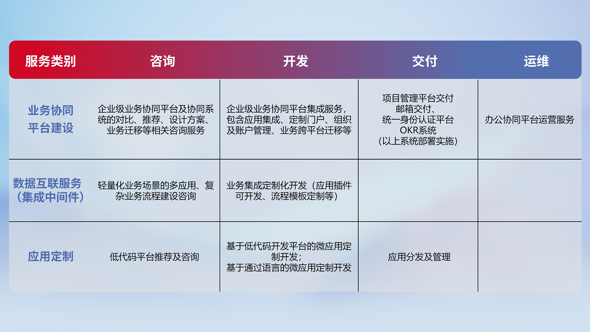 针对钉钉、、企微、、IDaas等平台级产品提供产品的规划、、、、方案、、、、交付、、定制化开发等服务,,,,实现如统一协同办公、、、、智能客户服务、、混合会议管理、、智能数据查询、、、、等业务场景,,,实现数字化转型。。